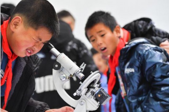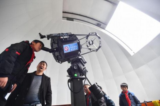 1月19日,在湖南省瀏陽(yáng)市小河鄉(xiāng)的星河天文臺(tái),學(xué)生(左一)在工作人員的指導(dǎo)下體驗(yàn)天文望遠(yuǎn)鏡。新華社記者 陳澤國(guó) 攝