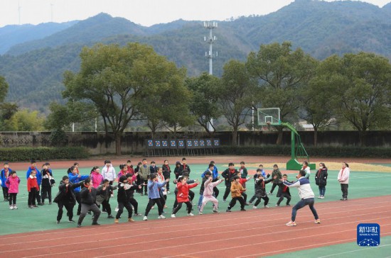 1月21日,在前童鎮(zhèn)中心小學(xué),童攀峰帶領(lǐng)學(xué)生們開展舞獅基本動作訓(xùn)練。