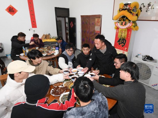1月21日,在前童鎮(zhèn)橋頭楊村,童攀峰(站立者)在家里招待舞獅隊(duì)成員進(jìn)行年度聚會。