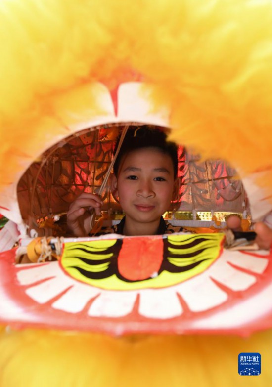 1月20日,在前童古鎮(zhèn),13歲的“少年獅王”張鎮(zhèn)浩在練習間隙留影。