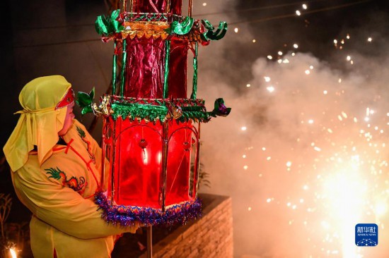 2月7日夜,龍里縣龍山鎮(zhèn)的村民扛著花燈參加“亮燈巡寨”活動(dòng)。