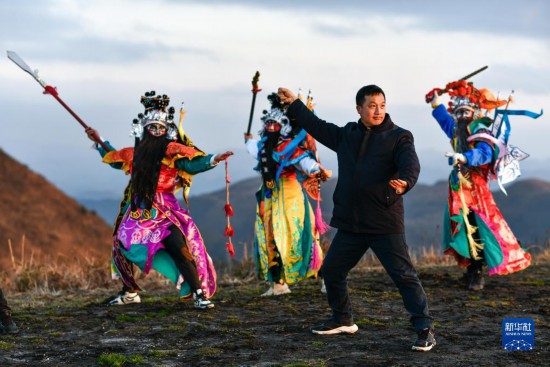 2月7日,龍里太平花燈戲藝人劉江(前)在村子附近的山頂上指導(dǎo)年輕人練習(xí)花燈戲。