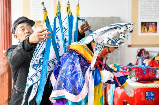 2月6日,龍里太平花燈戲藝人趙應(yīng)明(左)在給戲班成員整理行頭。