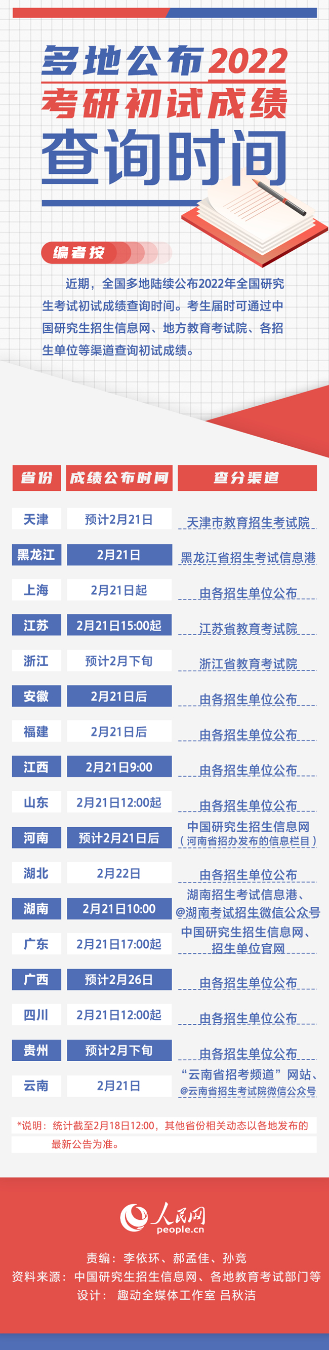 人民網(wǎng)北京2月18日電 (記者李依環(huán)、郝孟佳、孫競)近期,全國多地陸續(xù)公布2022年全國研究生考試初試成績查詢時間。考生屆時可通過中國研究生招生信息網(wǎng)、地方教育考試院、各招生單位等渠道查詢初試成績。