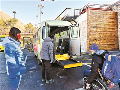 國家高山滑雪中心交通志愿者溫曉梅協(xié)助法國殘奧隊(duì)隊(duì)員乘車