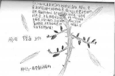 驚蟄,六年級(jí)的孩子們記錄了柳樹的變化!靶麻L(zhǎng)出的小芽們是害羞的,把小葉子卷起來了,好像用手遮住了臉龐。柳絮則由葉底上的幾個(gè)小顆粒變成了許多較大的長(zhǎng)條狀,都集中在一根小軸上”。“長(zhǎng)大了的柳絮變得像毛毛蟲,肥嘟嘟的,很可愛,馬上它就可以展開它華麗的一面,搖身化為美麗的蝴蝶了。新的旅程就要開始了”。面對(duì)自然的時(shí)候,孩子們不僅用眼睛看,也在用耳朵聽,用鼻子聞,用手去觸摸,用身體去感受。節(jié)氣里的自然筆記讓孩子們的感官不斷打開。