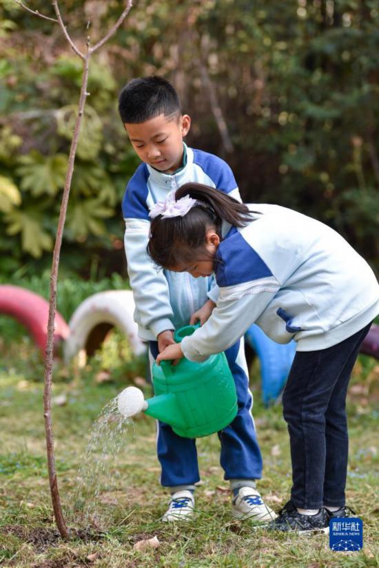 3月11日,在江蘇南京建鄴區(qū)金地名京幼兒園,小朋友給樹苗澆水。
