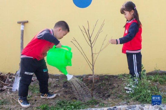 3月11日,在江蘇省海安市南莫鎮(zhèn)中心幼兒園內(nèi),小朋友為栽種的樹苗澆水。
