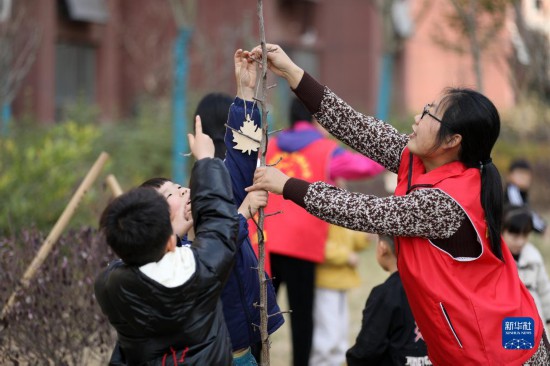 3月11日,在山東省臨沂市郯城縣郯城街道古城社區(qū),志愿者與孩子們?cè)趧傇灾驳木G化苗木上掛心愿卡。