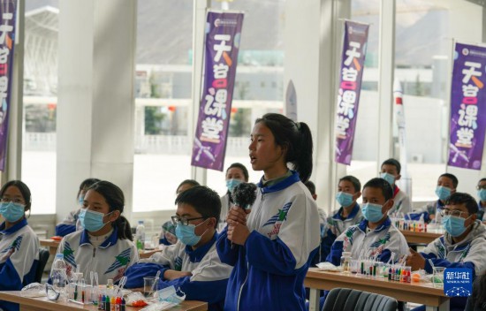 3月23日,在位于拉薩市的西藏自然科學(xué)博物館,學(xué)生代表旦增曲珍向航天員提問。