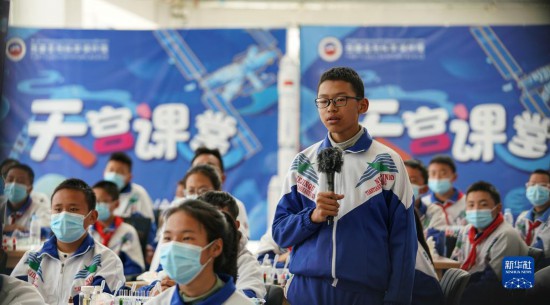 3月23日,在位于拉薩市的西藏自然科學(xué)博物館,學(xué)生代表洛桑念扎向航天員提問(wèn)。