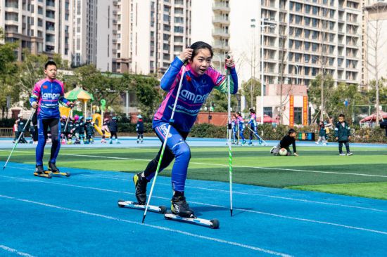 2022年2月24日,在重慶樹人博文小學(xué)的冰雪運(yùn)動體育課上,孩子們正在練習(xí)旱地滑雪。新華社記者唐奕攝