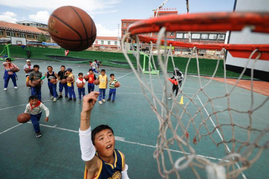 2020年6月14日,四川省阿壩藏族羌族自治州阿壩縣民族寄宿制小學(xué)的學(xué)生在體育課上練習(xí)上籃。新華社記者沈伯韓攝