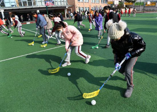 2022年1月11日,山東省青島市基隆路小學(xué)的同學(xué)們在體育課上練習(xí)旱地冰球。新華社記者李紫恒攝