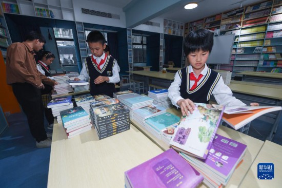 5月11日,湖州吳興區(qū)飛英街道月河小學(xué)四年級學(xué)生在校圖書室學(xué)習(xí)分類整理圖書。