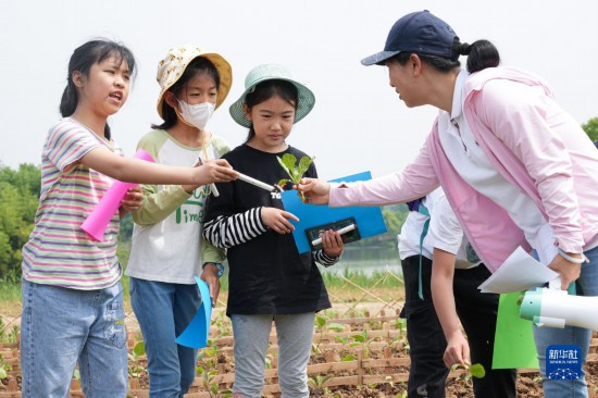 5月15日,在合肥市蜀山區(qū)南崗鎮(zhèn)“依依田園”,孩子們?cè)诶蠋煹闹笇?dǎo)下認(rèn)識(shí)農(nóng)作物。