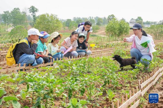 5月15日,在合肥市蜀山區(qū)南崗鎮(zhèn)“依依田園”,孩子們在老師的指導(dǎo)下認(rèn)識農(nóng)作物。
