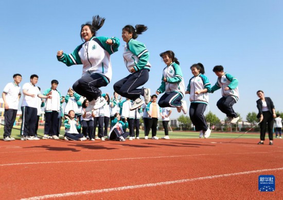 5月22日,青島通濟實驗學(xué)校高三學(xué)生在進行集體跳繩比賽。