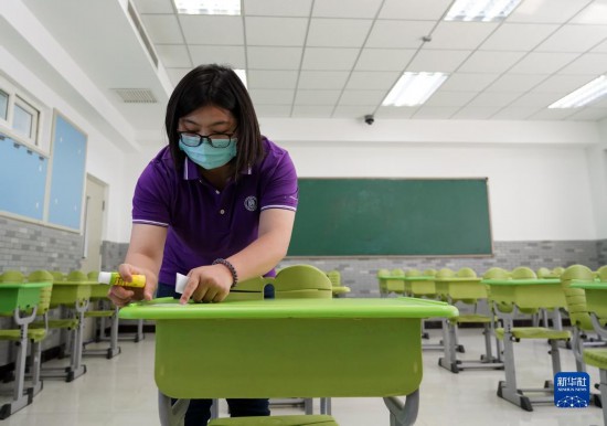 6月5日,在中國農(nóng)業(yè)大學(xué)附屬中學(xué)考點,考務(wù)人員在考場內(nèi)桌子上貼桌簽。