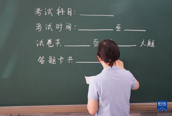 6月5日,在中國(guó)農(nóng)業(yè)大學(xué)附屬中學(xué)考點(diǎn),考務(wù)人員在黑板上寫考試信息。