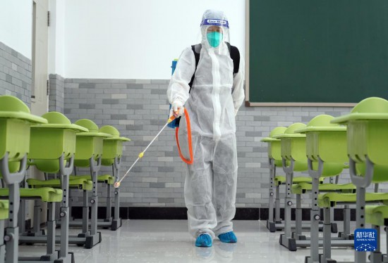 6月5日,在中國(guó)農(nóng)業(yè)大學(xué)附屬中學(xué)考點(diǎn),工作人員為考場(chǎng)消毒。