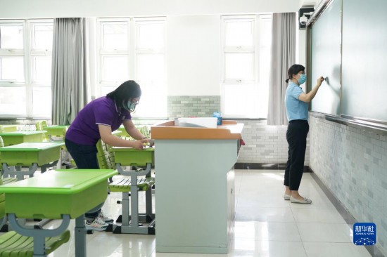 6月5日,在中國(guó)農(nóng)業(yè)大學(xué)附屬中學(xué)考點(diǎn),考務(wù)人員布置考場(chǎng)。