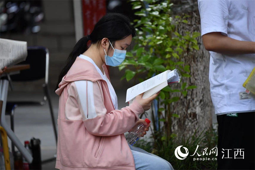 利用排隊(duì)的間隙,考生們抓緊時(shí)間復(fù)習(xí)。 人民網(wǎng) 時(shí)雨攝