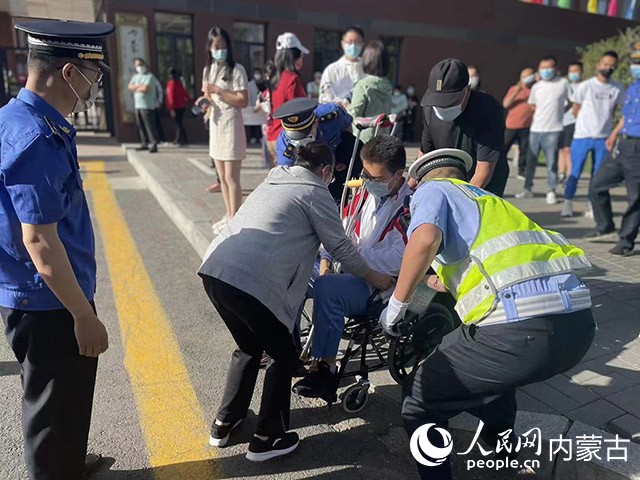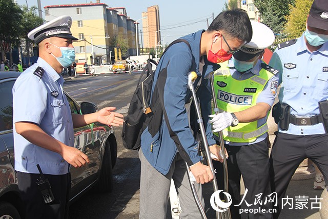 交警幫助骨折考生進(jìn)入考場。呼和浩特市交管支隊(duì)供圖