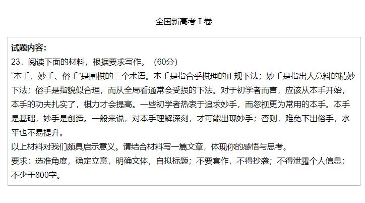 陳武評價,體現(xiàn)新時代,融匯新思想,突出新主題,應(yīng)該是今年高考作文命題的一個亮點。具體以圍棋術(shù)語“本手、妙手、俗手”作為抓手,談感受悟啟示,屬于正兒八經(jīng)的議論文。今年作文題目,不難!