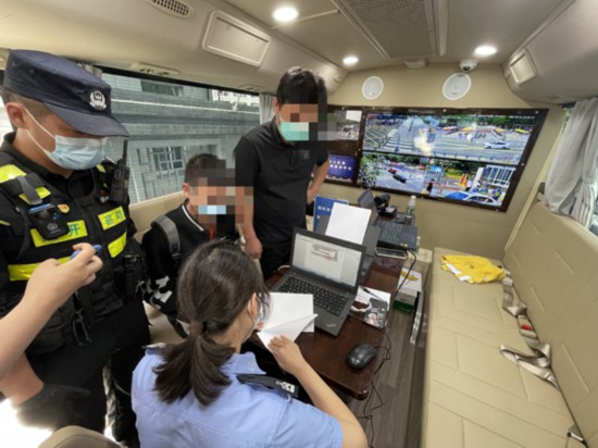 民警在移動(dòng)防控方舟進(jìn)行臨時(shí)身份證明辦理工作。無(wú)錫市公安局供圖