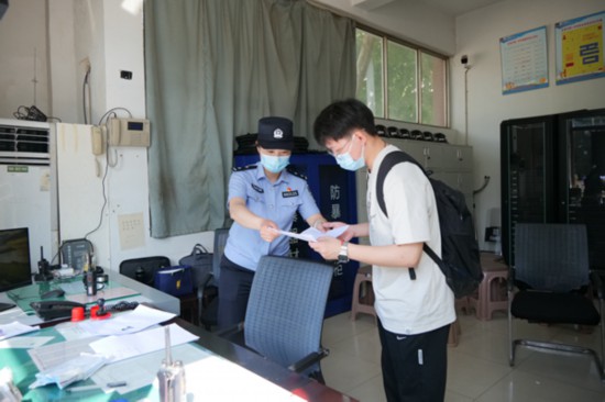 “請(qǐng)他到學(xué)校警務(wù)室,我們馬上采集信息!睂(duì)講機(jī)里,傳來了讓這位同學(xué)安心的聲音。在確認(rèn)其身份信息后,正在校警務(wù)室待命的鹽瀆派出所高考考生服務(wù)點(diǎn)民警蔡亞華迅速為其出具了臨時(shí)身份證明。從報(bào)告情況到將臨時(shí)身份證明送達(dá)考生手中,僅用時(shí)5分鐘。