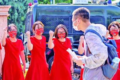 6月7日,在江蘇省南京市雨花臺中學考點,送考老師為考生加油鼓勁。新華社發(fā)(杜懿/攝)