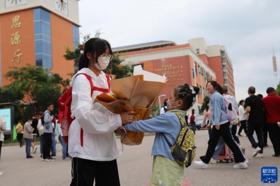 6月8日,在云南省曲靖市民族中學(xué),一名小朋友給考試結(jié)束的姐姐獻上鮮花。