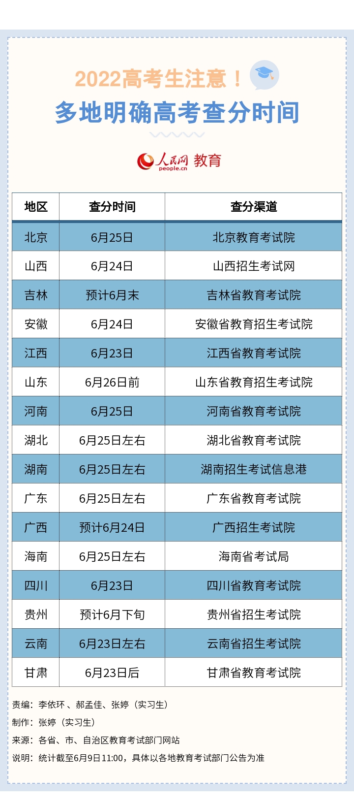 人民網(wǎng)北京6月9日電 目前,2022年全國多個省份的高考已落下帷幕?荚嚱Y(jié)束后,高考成績將于何時公布?有哪些查分渠道?人民網(wǎng)對已公布的查分時間及主要方式進行了梳理,以供廣大考生和家長參考。(李依環(huán)、郝孟佳、實習(xí)生張婷)