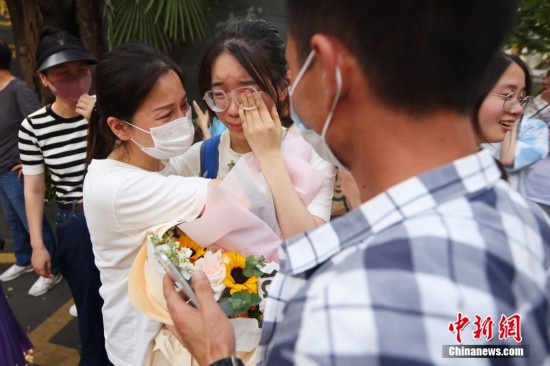6月9日,江蘇南京,一名結(jié)束高考的考生收到家長(zhǎng)送上的鮮花,激動(dòng)落淚。當(dāng)日,江蘇省2022年高考結(jié)束。 中新社記者 泱波 攝