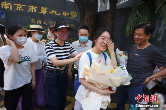 6月9日,江蘇南京,一名走出高考考場的考生收到家長送上的鮮花,激動落淚。當日,江蘇省2022年高考結束。 中新社記者 泱波 攝