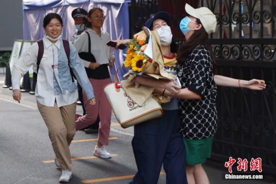 6月9日,全國(guó)部分地區(qū)高考收官,考生走出考場(chǎng)與親友慶祝。圖為江蘇南京,家長(zhǎng)迎接結(jié)束高考的考生。當(dāng)日,江蘇省2022年高考結(jié)束。 中新社記者 泱波 攝