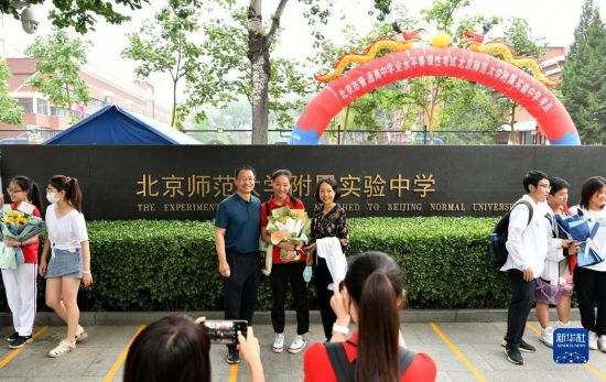 6月10日,在北京師范大學(xué)附屬實(shí)驗(yàn)中學(xué)考點(diǎn)門(mén)口,考生家長(zhǎng)和考生拍照留念。