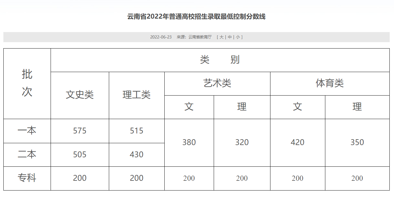 人民網(wǎng)北京6月23日電 (記者郝孟佳)據(jù)云南省教育廳消息,云南省2022年普通高校招生錄取最低控制分?jǐn)?shù)線劃定:文史類一本575分、理工類一本515分;文史類二本505分,理工類二本430分。