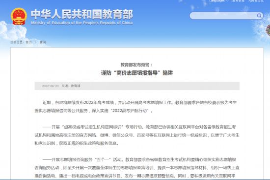 近期,各地將陸續(xù)發(fā)布2022年高考成績,并啟動開展高考志愿填報(bào)工作。教育部6月23日發(fā)布預(yù)警,提醒廣大考生和家長謹(jǐn)防“高價志愿填報(bào)指導(dǎo)”陷阱。