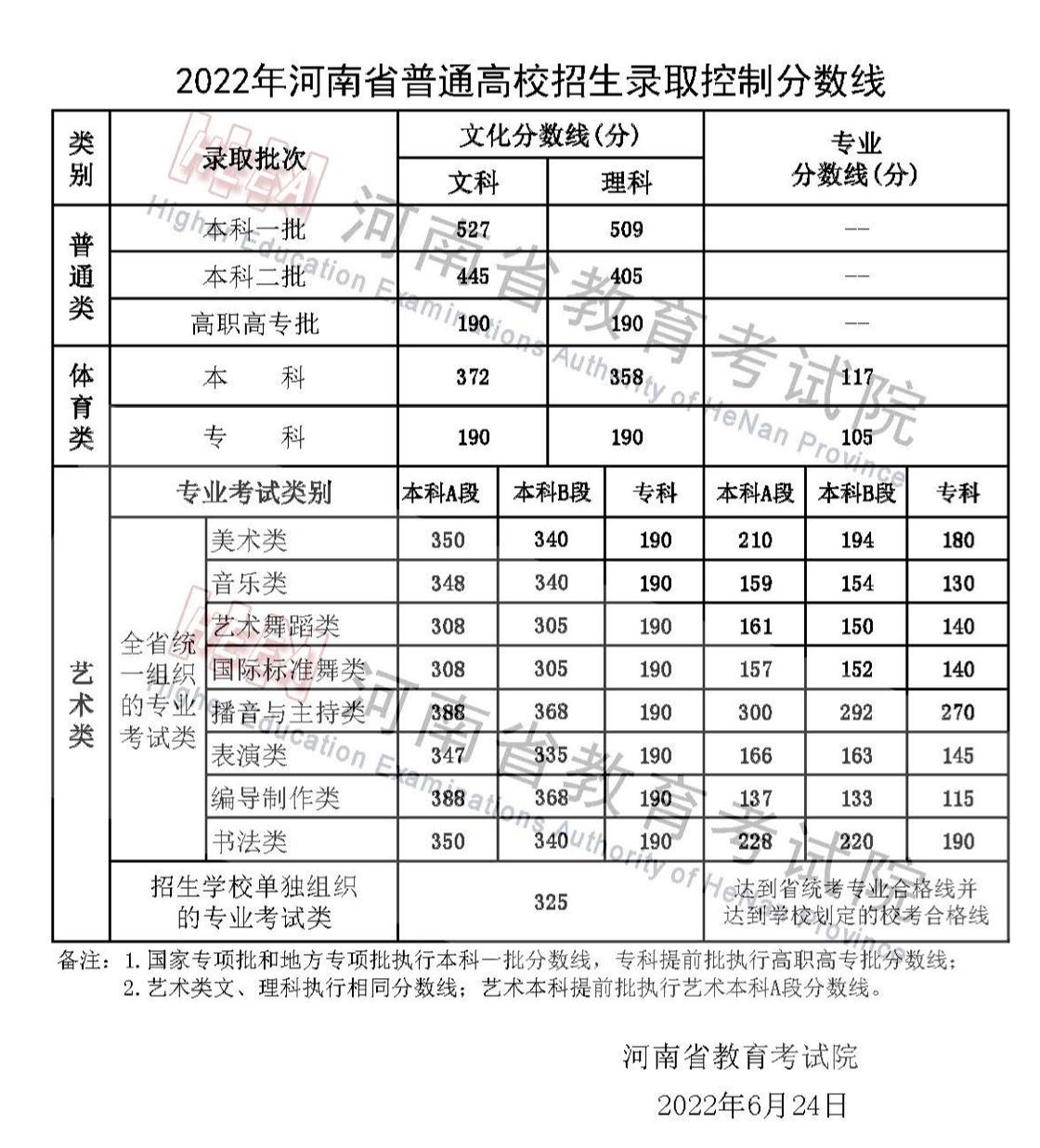 人民網北京6月24日電 (記者李依環(huán))據河南省教育考試院消息,2022年河南省普通高考本科各批次錄取最低控制分數線劃定,其中普通類本科一批文科527分,理科509分;本科二批文科445分,理科405分。