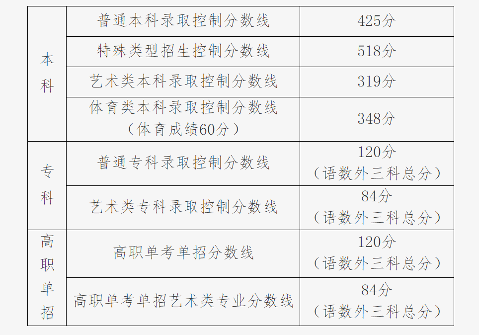 普通?其浫】刂品?jǐn)?shù)線120分(語數(shù)外三科總分),藝術(shù)類?其浫】刂品?jǐn)?shù)線84分(語數(shù)外三科總分),高職單考單招分?jǐn)?shù)線120分(語數(shù)外三科總分),高職單考單招藝術(shù)類專業(yè)分?jǐn)?shù)線84分(語數(shù)外三科總分)。