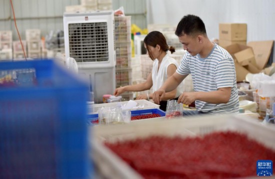 7月7日,在河北省邢臺市南和區(qū)南韓村的電商孵化基地,馮亞飛(右)在倉庫內分揀貨物。