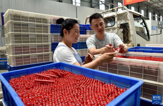 7月7日,在河北省邢臺(tái)市南和區(qū)南韓村的電商孵化基地,馮亞飛和員工核對(duì)發(fā)貨清單。