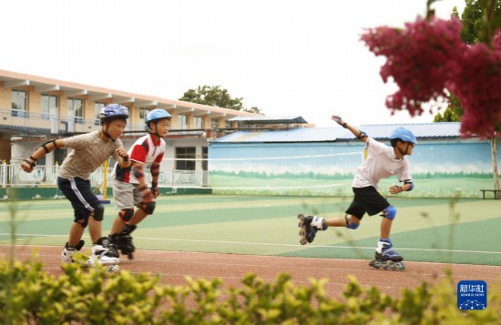 7月12日,在河北省邢臺(tái)市南康莊小學(xué),參加暑期活動(dòng)的孩子們練習(xí)輪滑。