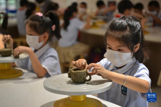 7月11日,河北省石家莊市柏林莊學校暑假托管班的小學生做陶藝。