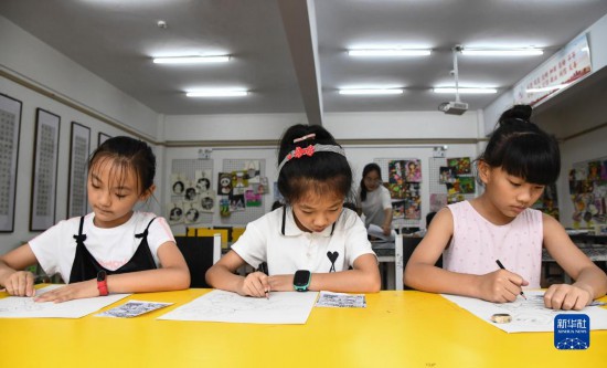 7月12日,在河南省濟源市國風(fēng)藝術(shù)培訓(xùn)學(xué)校,孩子們在練習(xí)繪畫。