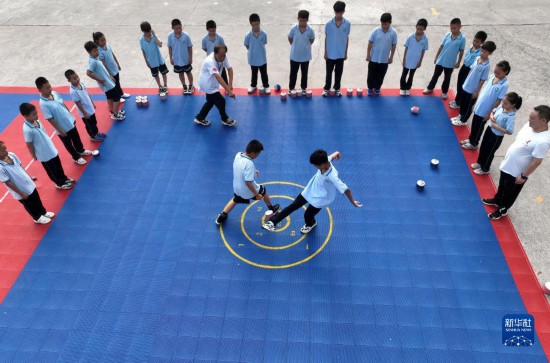 7月25日,河南省濟源市濟水東街學校的學生在練習踢足螺(無人機照片)。