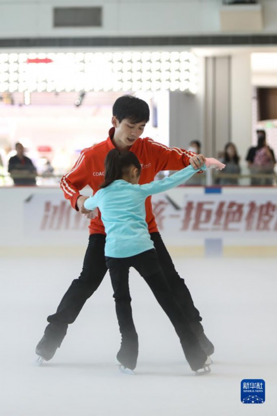 8月4日,在遼寧省沈陽市冰紛萬象冰場,一名小朋友在教練的指導(dǎo)下學習花樣滑冰。