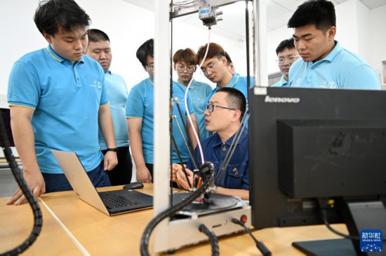 劉世雄(中)在天津機電職業(yè)技術學院的教室內(nèi)給學生布置任務(8月8日攝)。新華社記者 李然 攝
